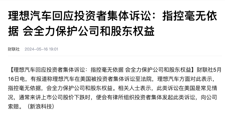 事情是這樣的,據報道,投資者向理想汽車提起了集體訴訟,起訴理由是“該公司及部分高管在本案訴訟期間進行虛假陳述,違反證券法令投資者受損”,他們要求理想汽車賠償“因其違法行為”導致股價下跌給投資者造成的損失。