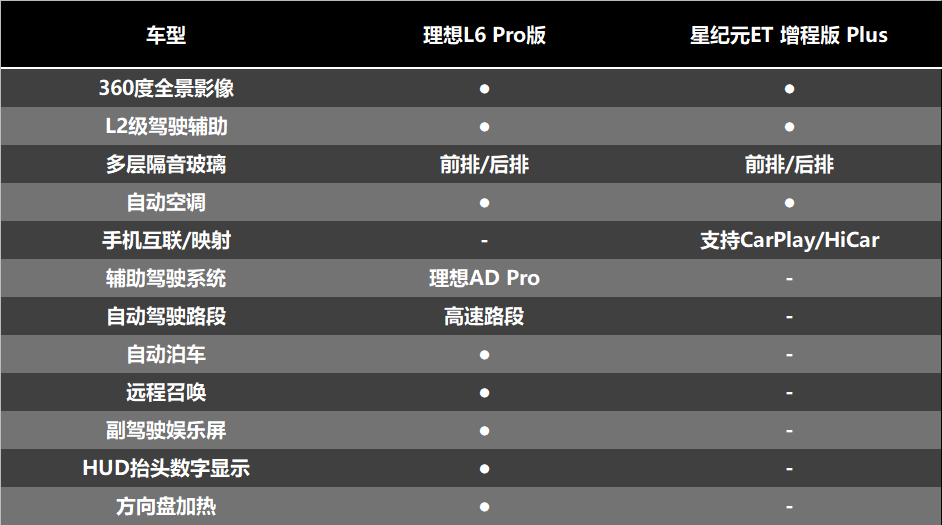 再來看下入門版車型的配置,星紀元ET增程Plus版配備了360度全景影像、L2級駕駛輔助系統、全車隔音玻璃、主副駕駛座椅電動調節、自動空調等,比理想L6多出了CarPlay 和HiCar,日常使用肯定是足夠了。