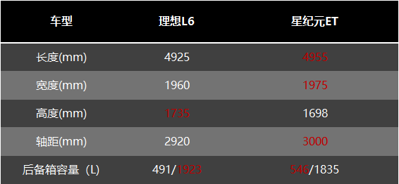 通過數據對比我們可以看出兩款車的三圍都比較接近,仔細對比,除了車高,星紀元ET的車長、車寬和軸距都要領先理想L6,理論上星紀元ET的乘坐空間更大,不過從實際的乘坐體感上來看,差距并不明顯。