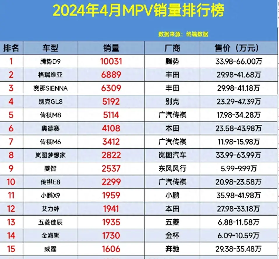 首先排2024年4月MPV銷量排行榜第一梯隊的有:
