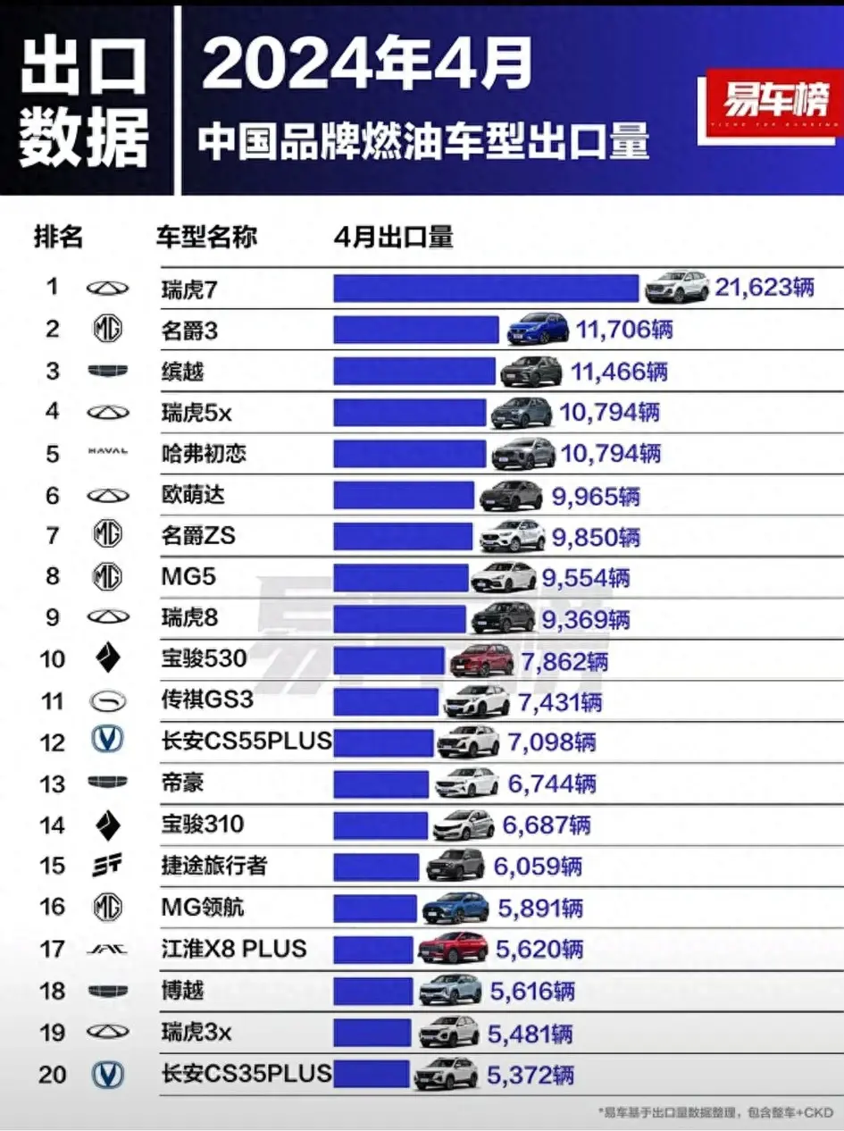 以前國產車一直不受國內消費者及國外消費者待見,然而自2020以來,自主品牌發生翻天覆地質變及量變,無論國內外消費者對國內自主品牌認可度有了很大提升。最新數據2024年4月中國品牌燃油車型出口量榜更新:瑞虎7 表現最佳出口2.1萬輛、名爵3 1.1萬輛、繽越、哈弗初戀均超 1萬輛。