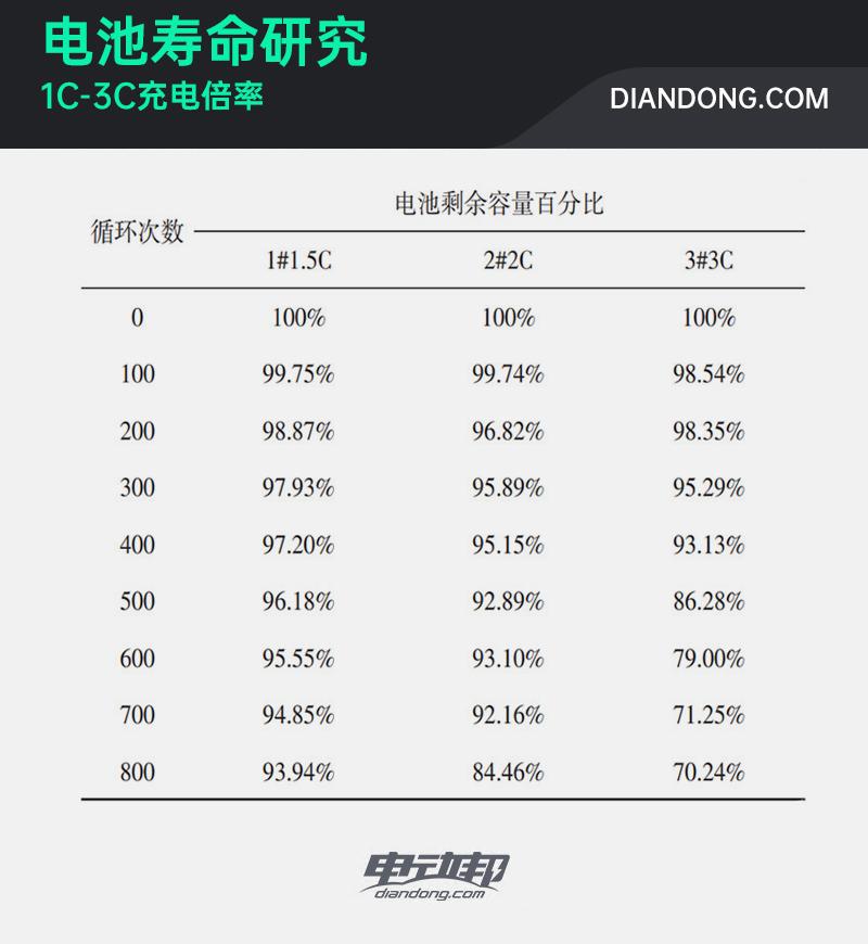 以上圖表,由實(shí)驗(yàn)室經(jīng)過測(cè)試后整理得出,實(shí)驗(yàn)對(duì)電池進(jìn)行了多達(dá)800次充放電循環(huán),最終統(tǒng)計(jì)出在不同充電倍率之下電池的剩余可用電量。
