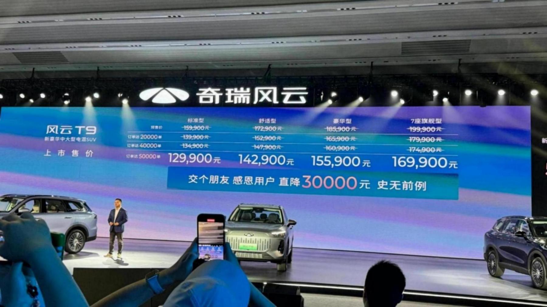2024年5月21日奇瑞風(fēng)云T9正式上市,新車共發(fā)布4款車型,指導(dǎo)售價(jià)12.99萬元--16.99萬元。動(dòng)力上,搭載1.5T C-DM插電式混動(dòng)系統(tǒng),WLTC綜合續(xù)航超過1400km。