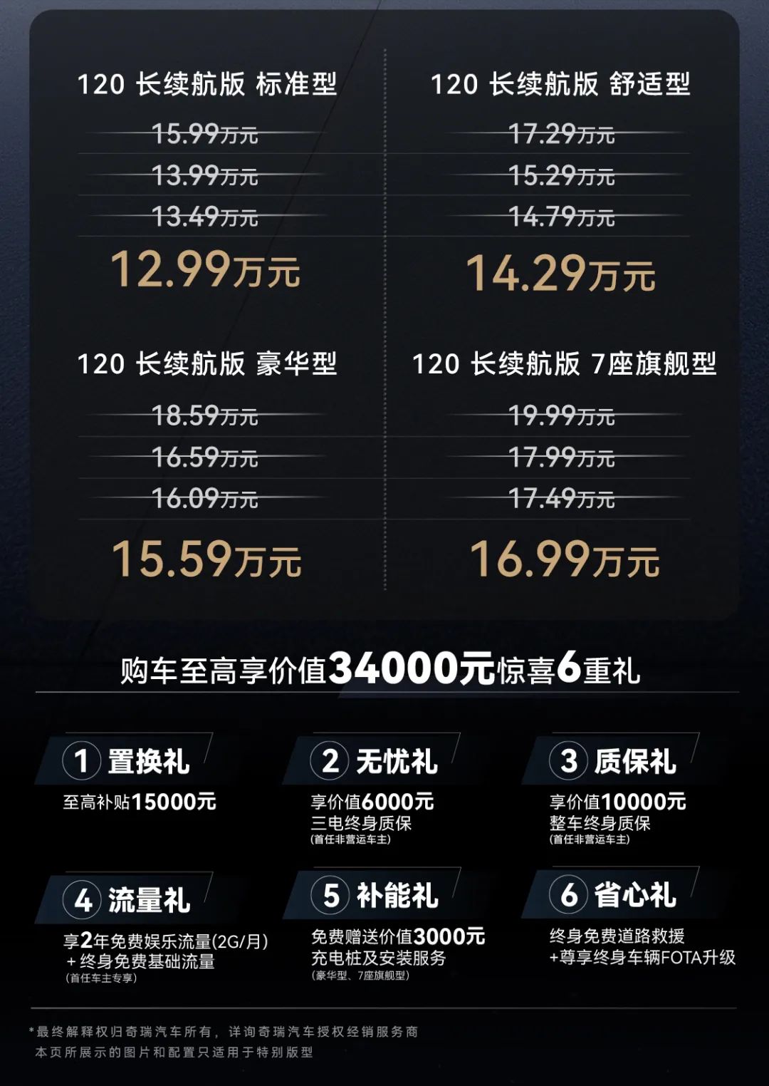 風(fēng)云T9是奇瑞風(fēng)云系列第二款車型,一款插電式混動中型SUV,提供四款選擇,正式售價(jià)為12.99萬元至16.99萬元。在公布售價(jià)的同時(shí),奇瑞汽車還帶來了一系列購車大禮:包括置換至高1.5萬元、三電終身質(zhì)保(首任非營運(yùn)車主)、整車終身質(zhì)保(首任非營運(yùn)車主)、首任車主終身免費(fèi)基礎(chǔ)流量+2年免費(fèi)娛樂流量,以及充電樁及安裝服務(wù)、終身免費(fèi)道路救援和FOTA升級等,禮包總價(jià)值高達(dá)3.4萬元。