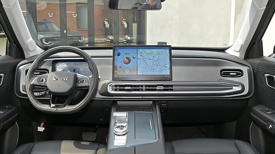 想要玩越野,就得考驗車輛的動力分配。但四個車輪里,有兩個天然無法傳遞動力,還怎么聊分配?其實這點沒那么絕對,比如說將后輪就視作打滑狀態,那么很顯然前輪有附著力,是可以實現脫困的。甚至單前輪擁有附著力的情況下,車輛脫困的概率依舊足夠高。因為前驅車型,特別是具備燃油驅動的前驅車型,其傳動效率更高。以全新北京BJ30為例,如果對其燃油版本最大188馬力的性能還有疑慮。那么其前驅的電驅版本,系統綜合功率可以達到335馬力,完全算得上是過剩。