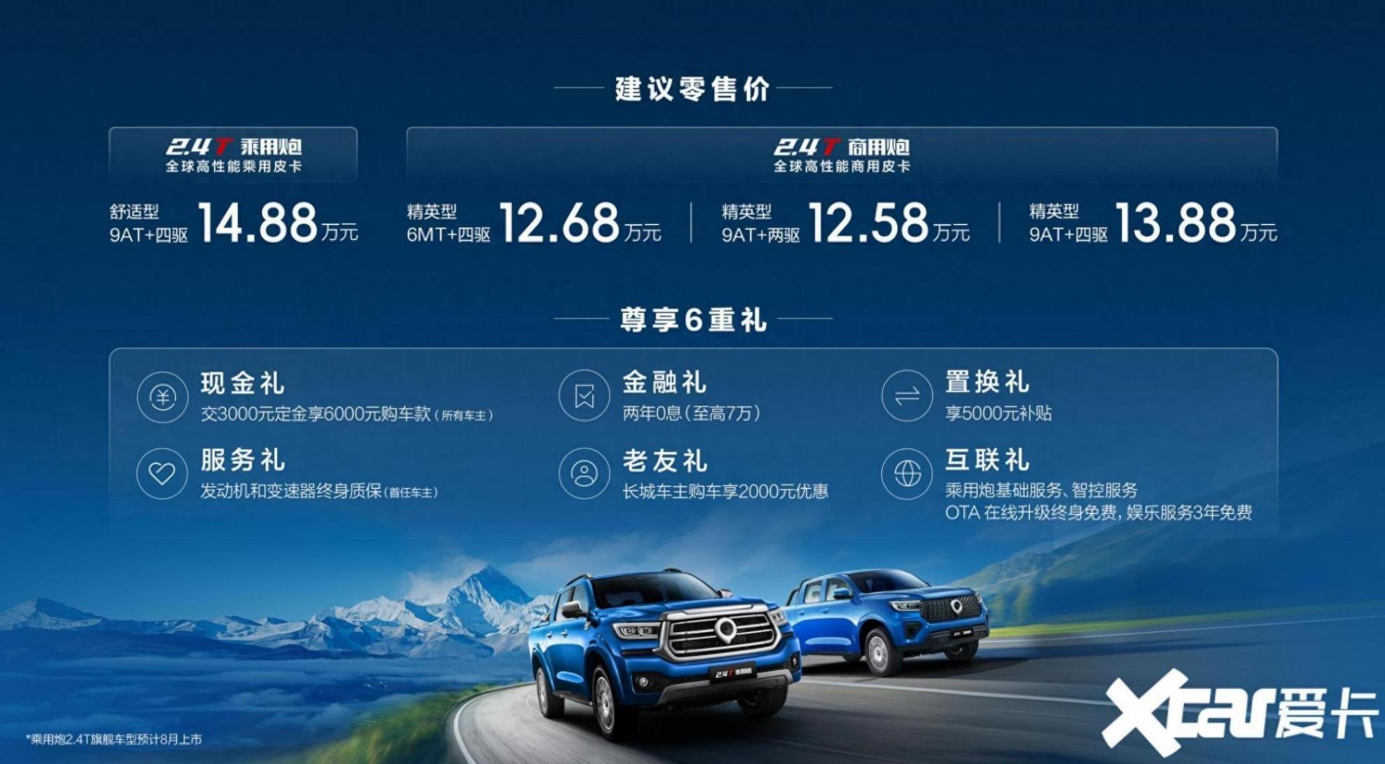 5月22日,長城炮品類創新力作全球高性能皮卡——2.4T乘用炮、2.4T商用炮正式上市,2.4T乘用炮9AT柴油四驅官方建議零售價14.88萬元;2.4T商用炮官方建議零售價12.58萬元-13.88萬元。