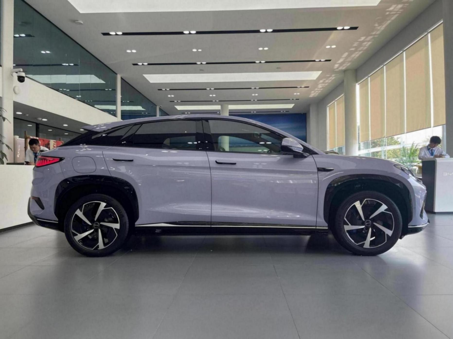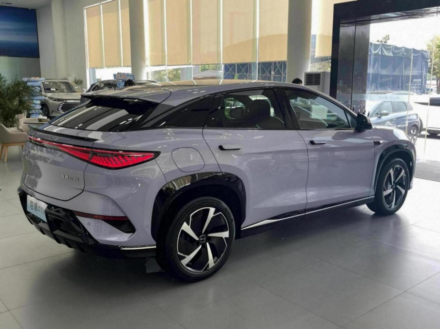 比亞迪海獅07EV長寬高分別為4830/1925/1620mm,軸距達到了2930mm,標準的中型SUV的尺寸。并且新車還會根據配置不同,提供19英寸或20英寸輪轂,本次實拍車輛采用了前235后255的前窄后寬的車胎布局,讓運動屬性不再只是紙上談兵。大尺寸輪轂結合流線型轎跑式車身,以及頗具肌肉感的腰線,使得新車側面呈現出強烈的運動氣質。
