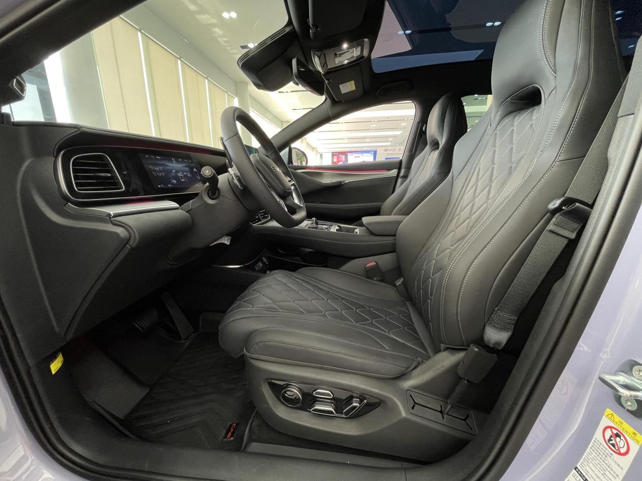 座椅方面,前排采用一體式設計,包裹仿皮和真皮面料,前排座椅電動調節/加熱/通風/主駕座椅電動腰靠等功能,后排座椅支持多角度調節,并且中央地臺為純平設計,對于中間位置的乘員來說也比較舒適。