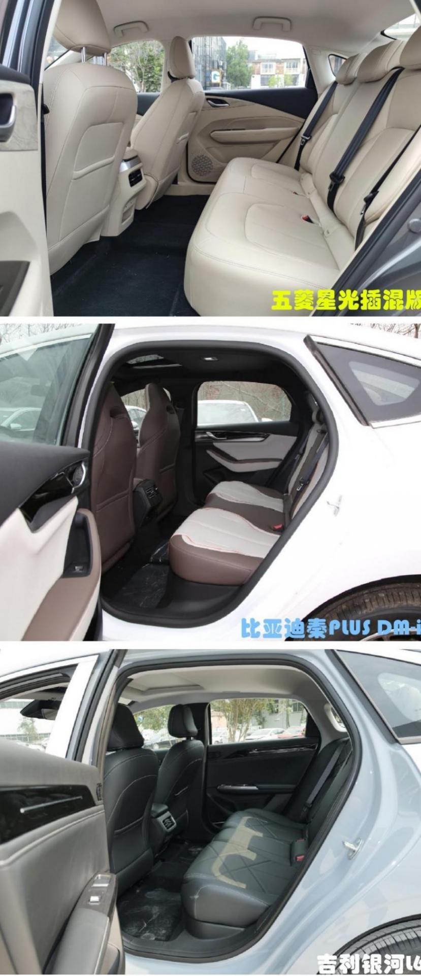 從車身尺寸上來看,五菱星光純電版有著無可比擬的優勢,而且真正反饋到空間上它也是最大的。五菱星光插混版的第二排過道寬度達到了390mm,腿部空間大,能以非常隨意的姿勢乘坐,跑長途也不會有疲憊感。而比亞迪秦PLUS DM-i以及吉利銀河L6的第二排空間表現也不錯,只是比星光插混版還略顯不足。