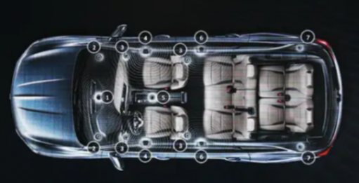 在音響的數量上,途昂龍耀版的數量最少(只有8枚)且無特殊品牌,分布于儀表臺、四門×4、車輛D柱×2、及尾箱×1;漢蘭達至尊版采用了JBL音響,數量增加到11枚,分別為A柱×2、儀表盤邊角×2、四門×4、尾門×2、尾箱左側×1;而昂科旗艾維亞版以多達14枚的BOSE音響組成的Centerpoint®環繞聲音響系統(其分布詳見下圖),不僅音箱的數量最多,而且分布的也比較密集,特別是對于前排座椅而言,因此在音效這一細分項上拔得頭籌。