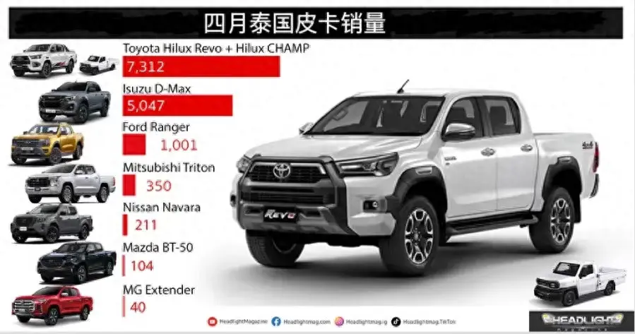 號稱“不死鳥”的豐田Hilux本月再次獨占泰國皮卡銷量榜首,4月售出新車7312臺。但需要注意的是,該銷量為Hilux Revo和Hilux Champ兩款車型相加的結果,而Hilux Champ橫向比對國內市場來看可以被認定為是一款輕卡或小卡,無論是動力儲備還是車內配置都遠不及目前國際上主流的皮卡車型,屬于是一款單純的拉貨干活車。不過整體來說,作為全球銷量第一的皮卡,豐田Hilux是在泰國還是具有廣泛的用戶基礎。