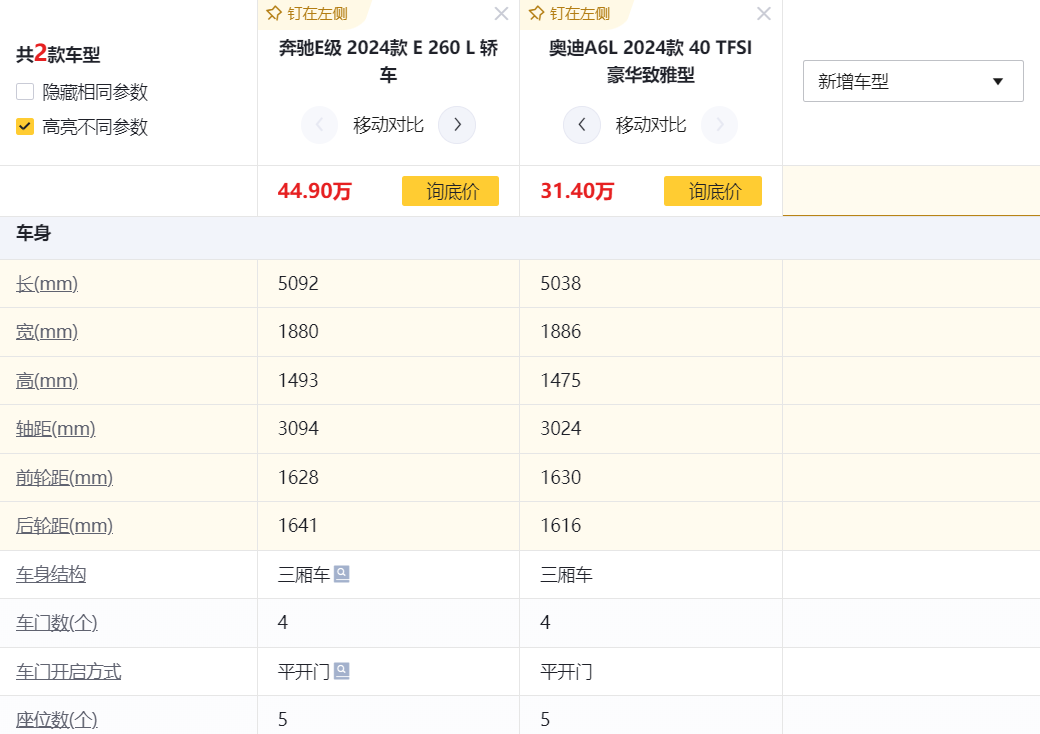接著來看到該車的空間表現(xiàn)。全新E級車的車身長5092mm、寬1880mm、高1493mm、軸距為3094mm,與停售的2023款(長寬高:5078*1860*1480mm,軸距3079mm)相比,全新E級車整體數(shù)據(jù)有了小幅提升,其在外觀體量和內部空間上將更有優(yōu)勢。此外,與同級競品奧迪A6L(車長寬高:5038x1886x1475mm,軸距3024mm)相比,全新E級車也要更大。