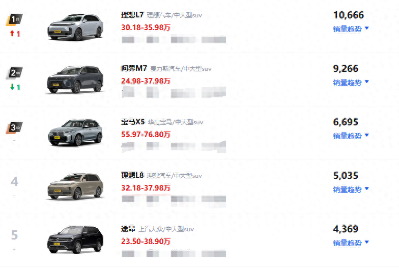 不得不說理想4月份賣得不錯,重回中大型SUV排行榜首位,但并不是它支棱起來了,而是因為問界M7跌落神壇,從3月份18512臺到4月份9266臺,少賣了大約一半。