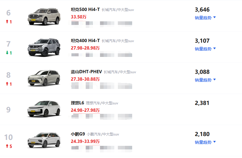 再往后的6-8名,被長城系包圓,兩款坦克和一款魏牌插混能有三千多臺的銷量挺不容易的。