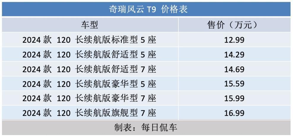 車型選擇方面,奇瑞風云T9共有6款車型,我們分別對比價格與配置差異: