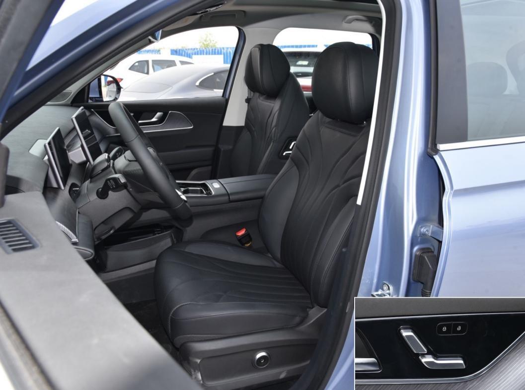 座椅采用仿皮材質,內部有10層填充物,厚實有彈性,與身體貼合度較高。坐墊長度充足,靠背與頭枕都有一定的側向支撐力。配置給得很足,除了常規6向電調,還有4向腰托,3檔通風與加熱和10點式氣袋按摩。提供女王副駕座,主駕的功能全部都有,還增加了電動腿托,最大開啟角度128°,靠背最大角度125°,可舒適躺平。