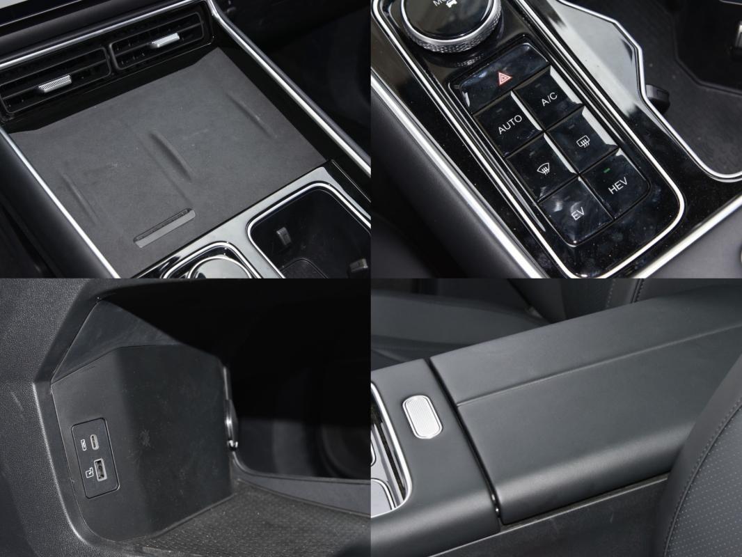 扶手臺以儲物空間為主,但保留了實體控制區,提供常用按鍵和駕駛模式選擇旋鈕。儲物空間豐富,前方雙手機位左側帶50W無線充電,右側有雙杯架。扶手箱容積可觀,下方懸浮空間較高,能放置較大件物品,門板儲物格也比較實用。