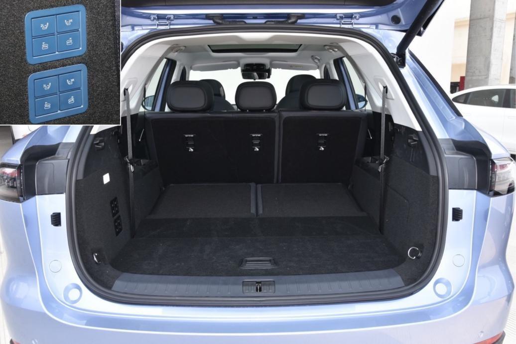 后排座椅使用時,尾廂縱深較淺、容積有限,后排座椅支持5:5分割放倒,平整度高,此時容積達到815L,足夠旅行之需。這臺頂配車型也是全系唯一提供后排座椅電動調節的,在尾廂側壁布置了按鍵,十分便利。中排座椅也支持4:6分割放倒,最大容積可達2065L,采買大件物品都不愁。