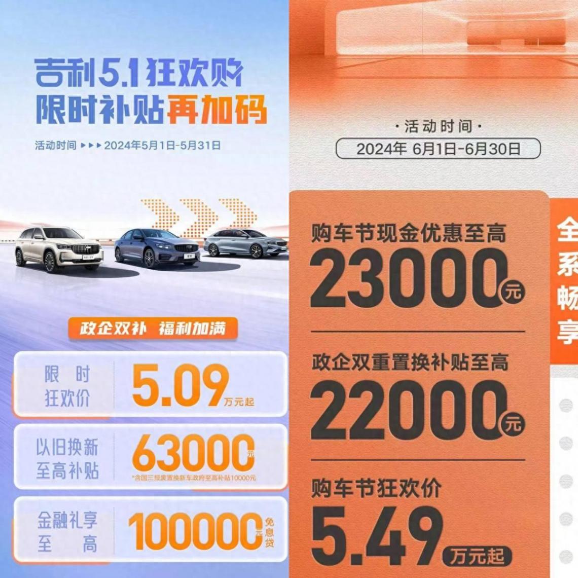 具體來看,自主品牌方面,吉利汽車6月限時購車權益調整為:現金優惠至高2.3萬元,政企雙重置換補貼補至高2.2萬元,全系車型最低5.49萬元起步。作為對比,5月吉利品牌綜合“以舊換新”至高補貼為6.3萬元,全系車型限時最低5.09萬元起步。