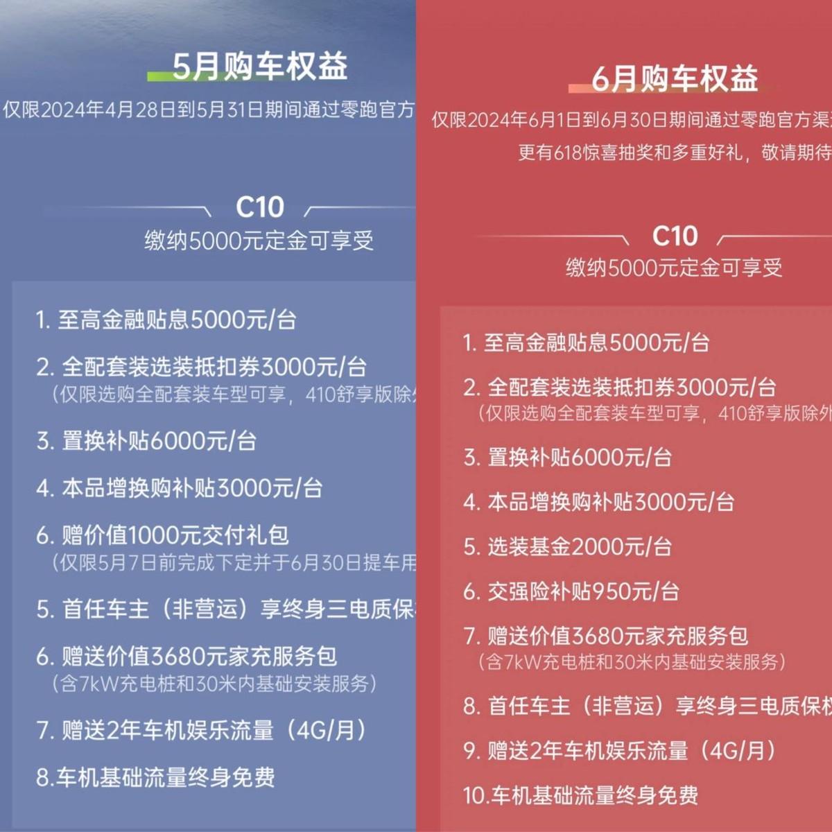 零跑汽車方面,相比于5月份的優惠政策,C10、全新C11和C01、全新T03等車型6月份的購車權益基本與上月保持一致,不過取消了價值2000元/臺的選裝基金(T03是1000元/臺)以及950元/臺的交強險補貼。
