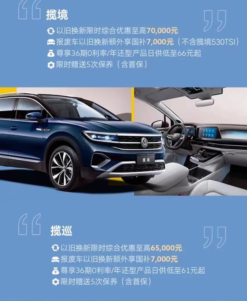 合資品牌方面,一汽-大眾攬境、攬巡、探岳、探影、邁騰、CC家族等車型以及ID.7 VIZZION、ID.6 CROZZ、ID.4 CROZZ等新能源車型6月份的優惠力度基本與5月份保持一致,探歌、速騰、寶來等車型的綜合優惠力度在5月份的基礎上有所上調,漲幅為3000元,高爾夫優惠力度上調5000元后,綜合優惠至高3萬元。