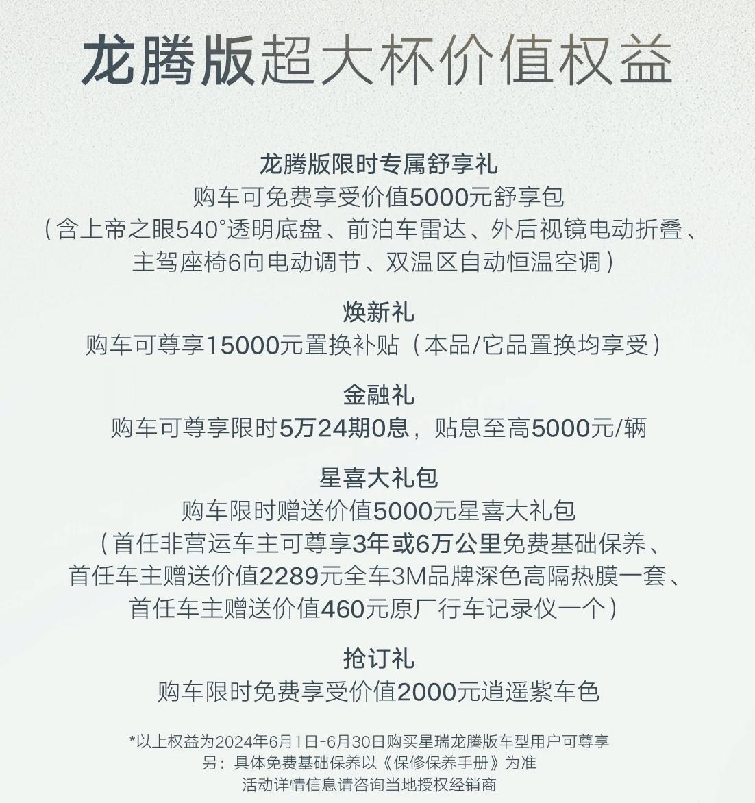 針對(duì)星瑞龍騰版車型,在6月30日之前購車的話,官方提供了價(jià)值5000元的舒享包(540度全景影像、前雷達(dá)、外后視鏡電動(dòng)折疊、主駕駛6向電動(dòng)調(diào)節(jié)、雙區(qū)自動(dòng)空調(diào)等),同時(shí)還有1.5萬的置換補(bǔ)貼、首任非營(yíng)運(yùn)車主享3年或6萬公里免費(fèi)基礎(chǔ)保養(yǎng)等,這些購車政策可謂相當(dāng)實(shí)在,從購車到用車,可以節(jié)約不少成本。