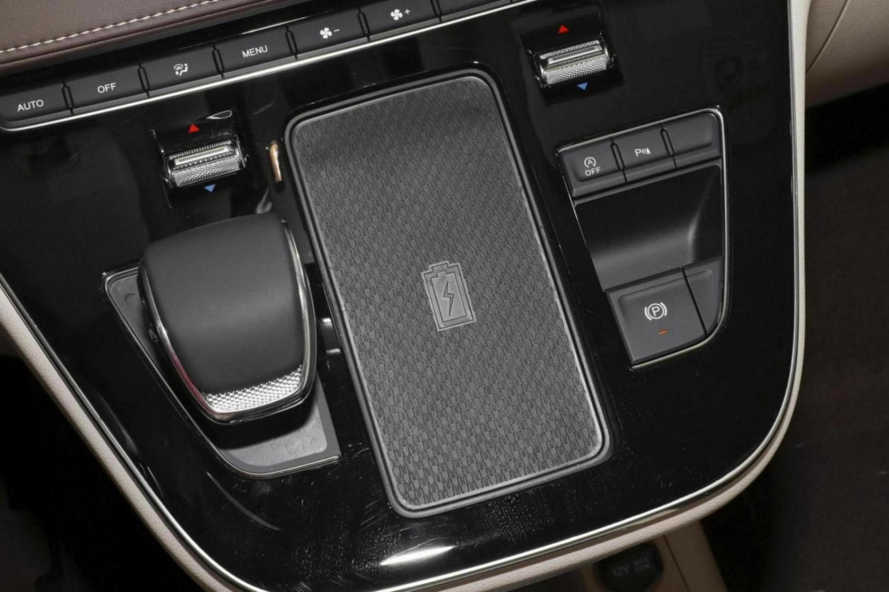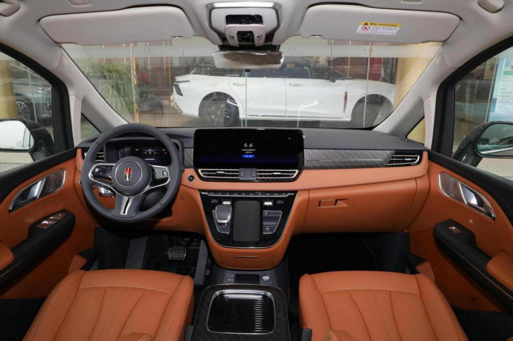 進入奔騰M9的內飾,整個內飾風格幾乎就是直接引用了紅旗HQ9的設計,只不過方向盤上的Logo更換成了奔騰。中控臺是MPV車型常見的布局,電子擋把也集中于此,正中央是一個放置手機的區域,頂配車型這里集成了無線充電功能。