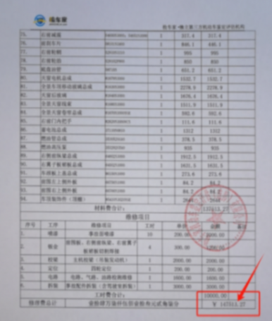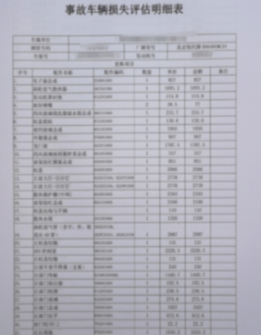 經過我們前期的勘驗,總結出來的車損還是比較高的,可以看到密密麻麻都是需要修復或者更換的部件。