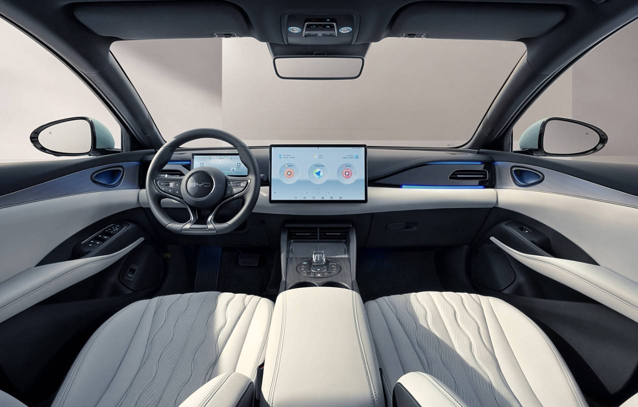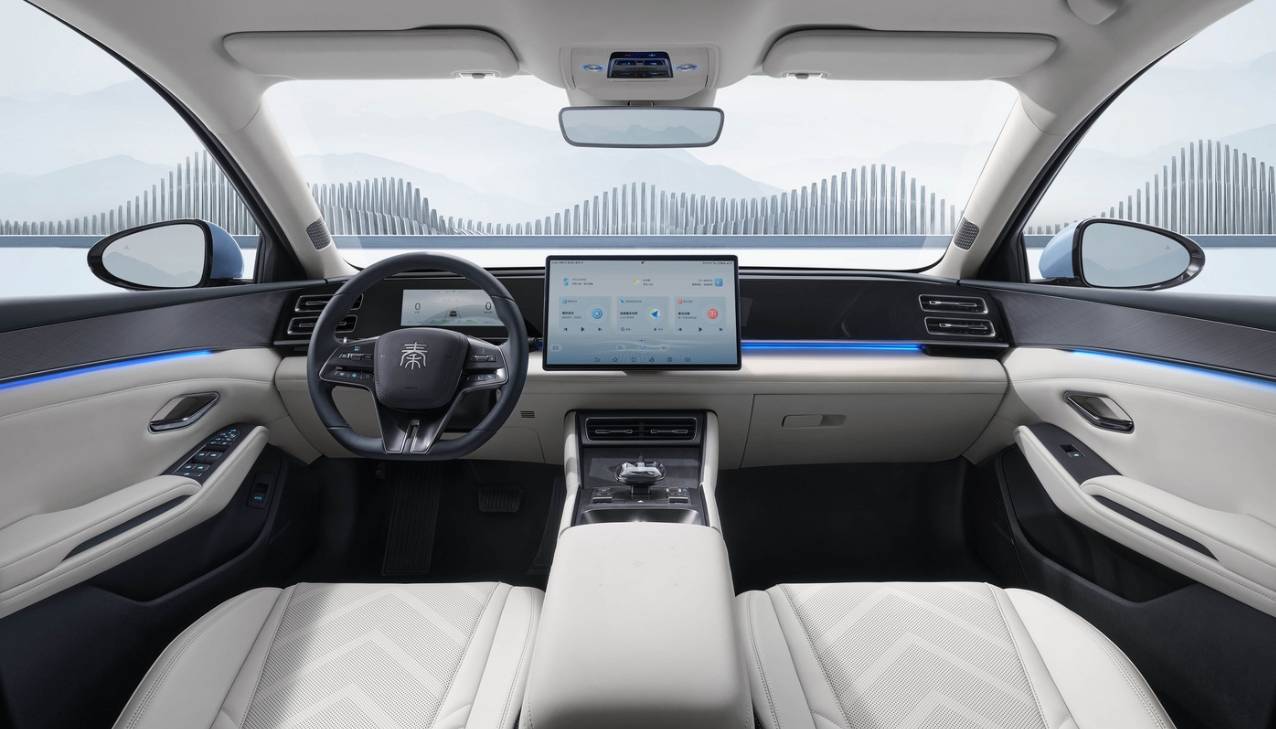 內飾兩車也做出了迥然不同的風格,一個穩重傳統一個年輕個性。但我個人也是更喜歡海豹06的設計,先說方向盤,同樣是平底運動的造型,秦L的配色和細節設計就“老氣”一些。而海豹06就是能勾起你這種想駕馭它的感覺,其它細節如配色和座椅設計都有意無意的推動你去這樣想。另外秦L的中控臺是階梯式設計,主駕儀表屏幕集成在烤漆面板之中,看起來就沒有海豹06獨立設計的顏值高,但屏幕尺寸和基礎配置等等它們都是一樣的,怎么選看你的喜好。