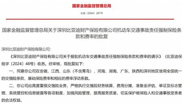 事實上,早在2023年11月比亞迪財險的車險業務(含交強險,商業險)就已獲得批準,近日,國家金融監督管理總局又正式批復了比亞迪在安徽,江西,山東(不含青島),海南,湖南,廣東,陜西和深圳地區使用全國統一的交強險條款,基礎保險費率和相應的費率浮動系數。這表明,交強險這一比亞迪財險的第一只靴子終于落地。
