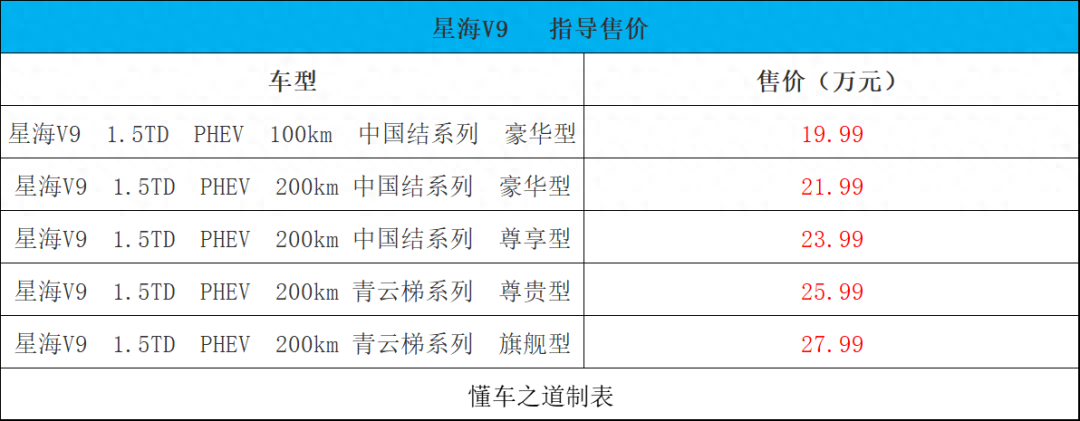 動力方面,星海V9搭載1.5T插電式混動系統,其中1.5T發動機的最大功率為154馬力,峰值扭矩為230牛·米。電機的最大功率為150kW(204馬力),峰值扭矩為310牛·米。續航方面,提供純電續航里程100km和200km兩種配置(CLTC工況),對應綜合續航分別為1200km和1300km。官方表示,其CLTC標準下饋電綜合油耗為5.27L/100km,0-100km/h加速時間為8.8秒,另外還配備3.3kW外放電功能。