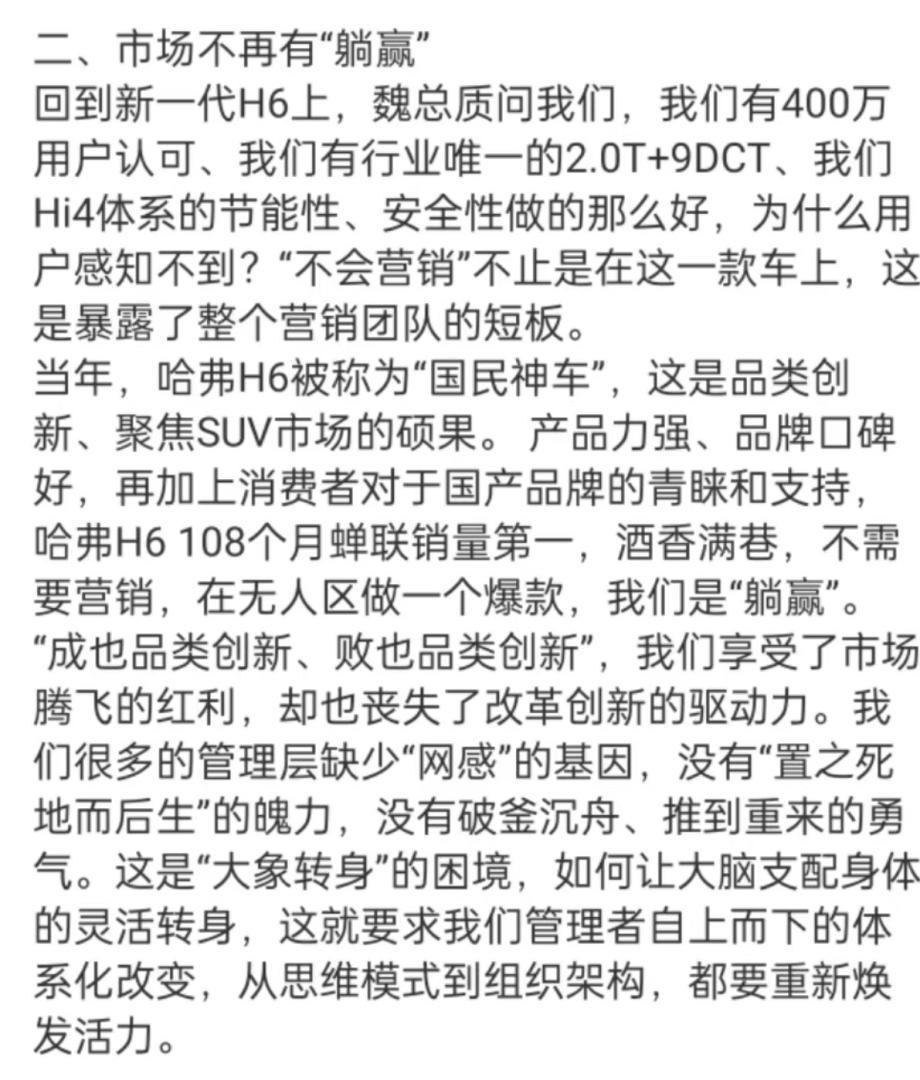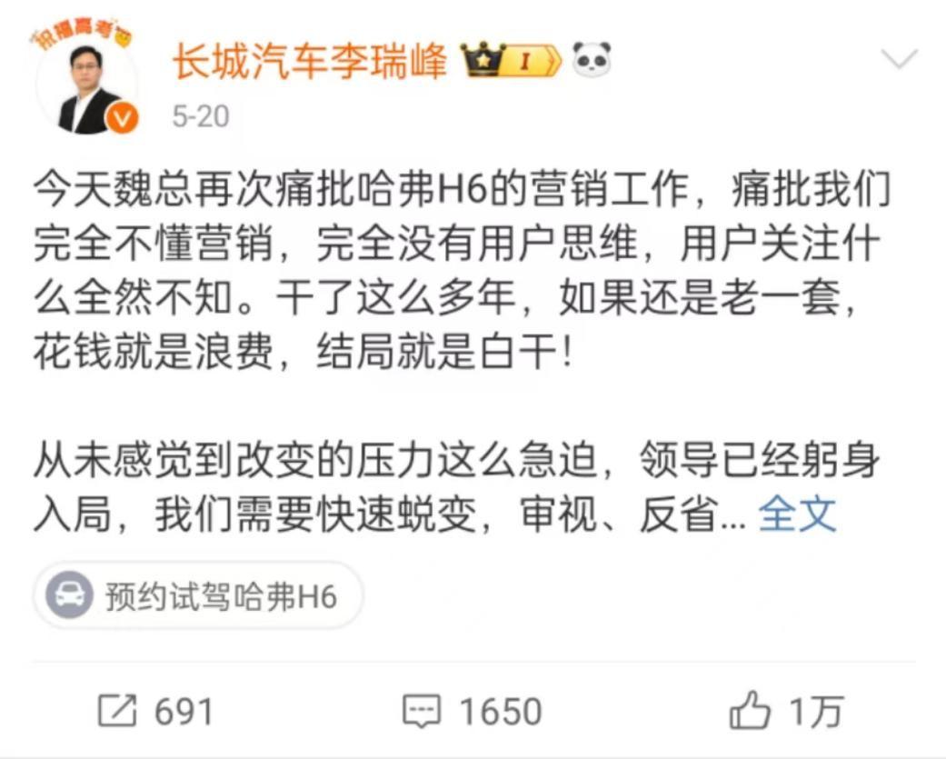 隨后,長城首席增長官李瑞峰長文回應了這一事件,對于魏建軍的痛批“大加贊賞”。表示魏建軍給整個企業“打樣”,哈弗H6的營銷確實沒做好。