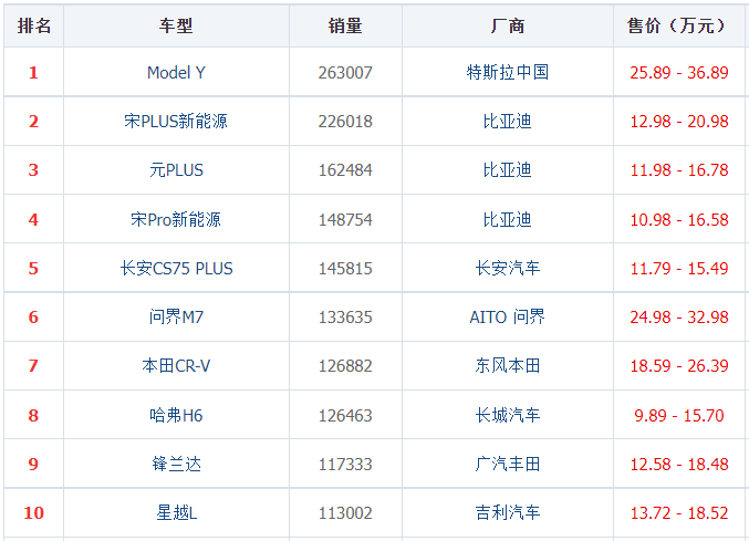 以微弱的劣勢輸給CR-V和CS75 PLUS當然也很遺憾,但這壓根不是根本。要知道真正賣得最多的車型還是Model Y和比亞迪宋家族,哈弗H6與它們其實壓根對不上。