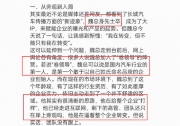 我們連看一下李瑞峰的回復,開篇就是一頓吹捧。魏總身先士卒,長城上下深感慚愧。魏總是國內汽車行業第一人,魏總給整個企業“打樣”。不得不說邏輯清晰,表達層層遞進,如果不是知道兩人的身份,大多數人可能會以為這是某個官方機構“筆桿子”的發言。