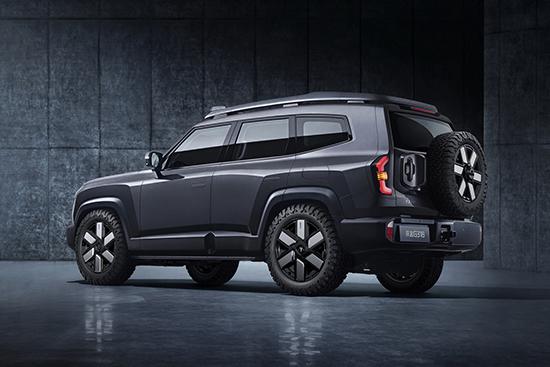 外觀方面,深藍 G318 采用硬朗的車身線條設計,整車造型較為方正,彰顯其硬派 SUV 的定位。車頭采用封閉式格柵設計,長條形裝飾板與 C 字形大燈相貫通,視覺整體感較強。前包圍造型較為厚重,搭配車頂探照燈以及外掛式備胎,越野氣息十足。