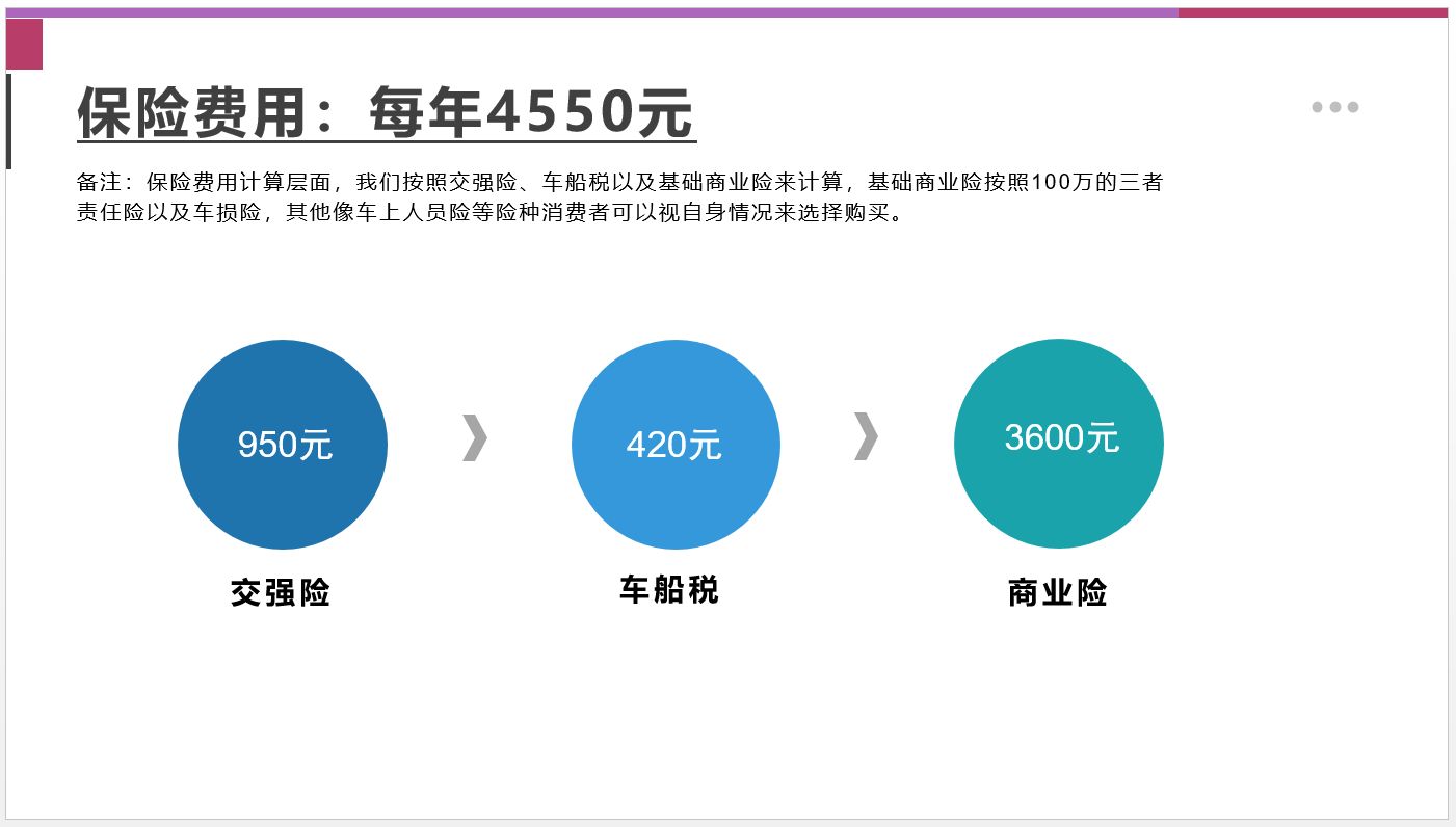 保險費用計算層面,我們按照交強險、車船稅以及基礎商業(yè)險來計算,基礎商業(yè)險按照100萬的三者責任險以及車損險,其他像車上人員險等險種消費者可以視自身情況來選擇購買。我們的價格不考慮多年不出險的市場折扣價。