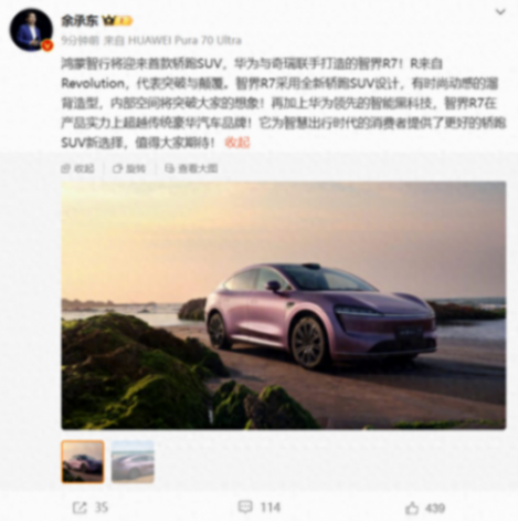 6月11日消息,華為常務董事、終端 BG 董事長、智能汽車解決方案 BU 董事長余承東今日官宣,鴻蒙智行將迎來首款轎跑 SUV,華為與奇瑞聯手打造智界R7。