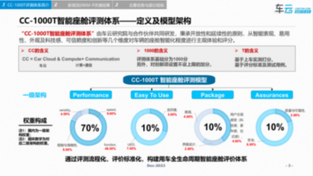 CC-1000T是車云研究院與合作伙伴從消費者體驗角度出發,共同研發的智能座艙評價體系。“體系”將從性能、功能、旅程和座艙創新四大維度,結合用戶需求、功能訴求、核心旅程體驗和因車而異的獨創功能,以打分的形式,綜合評價各款車型的座艙智能化表現。