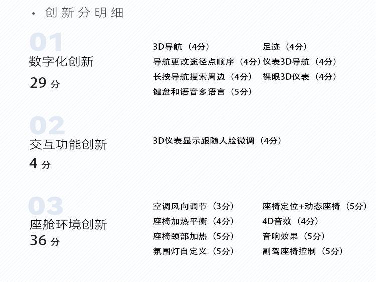 再說評測過程與結果量化。我們會對這些基礎項之外的創新功能進行評分,并將它們分為交互功能創新、數字化創新和座艙環境創新三類,以此更完善的對智能座艙的創新進行評價。