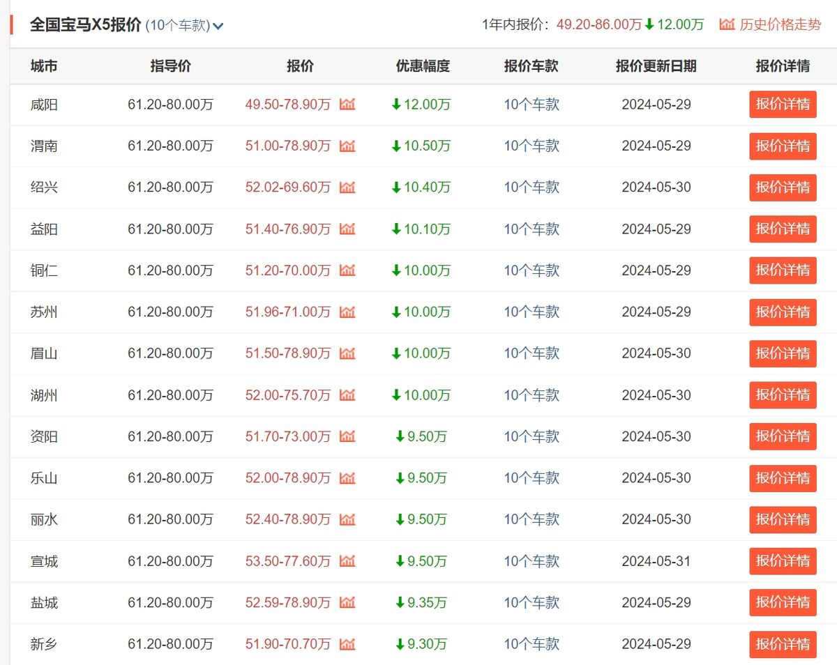 國產寶馬X5降價到底有多狠?從汽車網站上了解到的信息來看,目前在國內很多城市國產寶馬X5的降價幅度到達到了10萬元,部分城市最高降幅甚至來到了12萬元,與兩年前需要變相加價購買形成了鮮明對比。