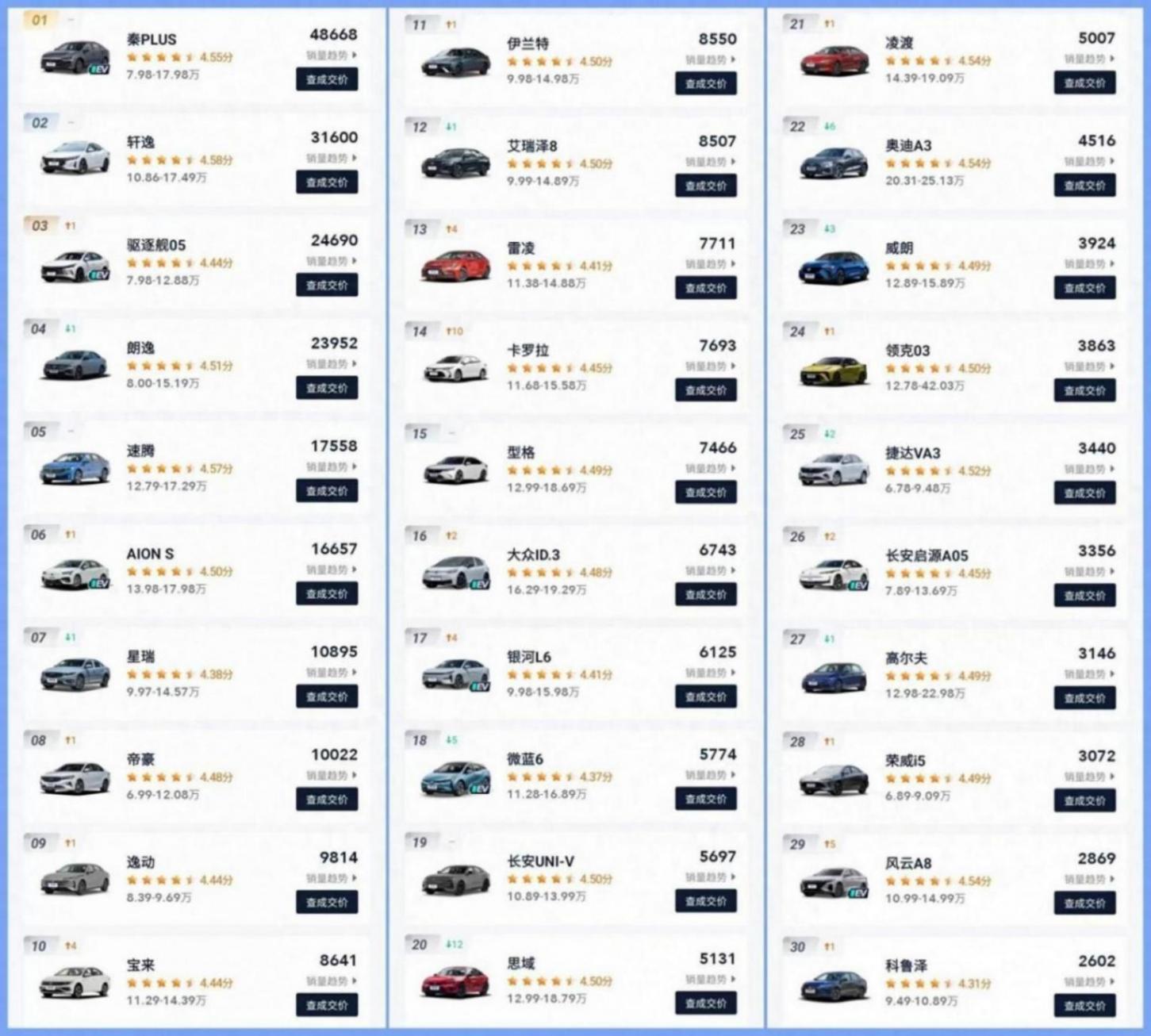 2024年5月緊湊型轎車排行榜TOP30,你家愛車排第幾?