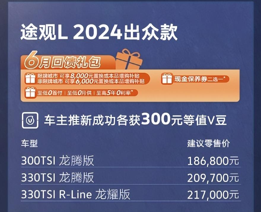 為了回饋廣大消費者的厚愛和支持,上汽大眾還推出了多項優惠政策。無論是置換還是增購途觀L 2024出眾款,都能享受到6,000/8,000元的補貼。而車主推新成功更是能各獲300元等值V豆獎勵。此外,還有至低0首付、至低0月供、至高5年0利率等多種金融方案可供選擇,讓消費者能夠輕松購車、無憂用車。