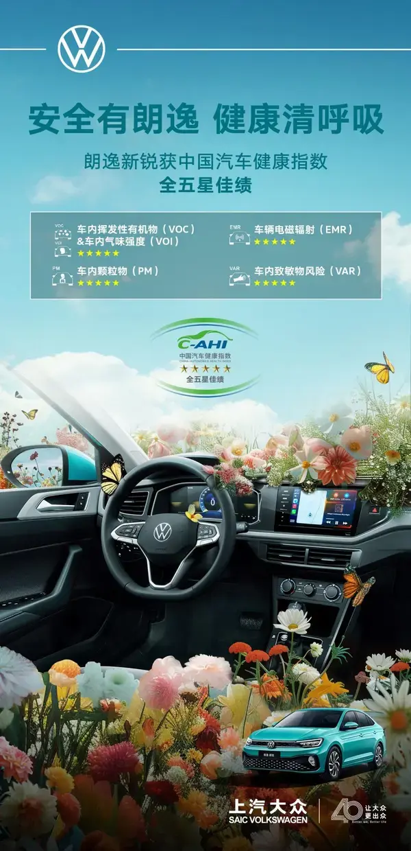 第二個原因,則是同樣在今年,中國汽車健康指數(c-ahi)公布測評結果,朗逸新銳在“車內揮發性有機化合物與車內氣味強度(voc&voi)”“車輛電磁輻射(emr)”“車內顆粒物(pm)”,以及“車內致敏風險(var)”等所有測試板塊均獲得五星成績。特別是在“車內顆粒物(pm)”測評項目中,朗逸新銳獲得滿分成績。