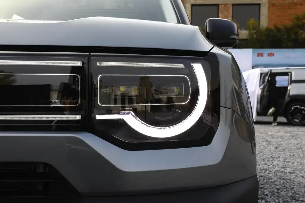 外觀方面,北京BJ30的整體走線非常硬朗粗獷。由于新增了新能源車型,北京BJ30將原本非常具有辨識度的巨大鍍鉻五孔前格柵的區域,創造性地改造為一張橫貫車頭的包覆燈罩;而真正的進氣格柵,則被隱藏在燈罩中部下面的前臉中部區域。當日行燈點亮時,會形成一條十分顯眼的貫穿式燈帶,這種設計在繼續維持了北京吉普家族式設計風格的同時,也十分具有辨識度。