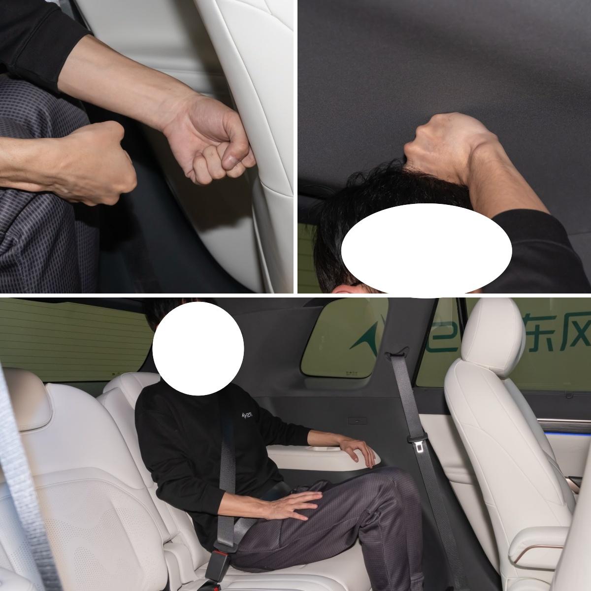 接著來看到eπ008的空間表現。新車定位為C級SUV,車內座椅布局為2+2+2,,得益于5002mm的車長和3025mm的軸距,前排和第二排的乘坐空間不用多說,寬敞度有目共睹,我們將重點放在容易忽略的第三排空間,身高180cm的朋友坐在第三排,在第二排座椅調至合適位置后,腿部間隔大約有2拳左右,頭頂則剩余1拳的空間,整體乘坐下來不局促。也就是說,新車即使是滿員乘坐,第三排乘客也不會因過于拘謹而導致乘坐感受不適。