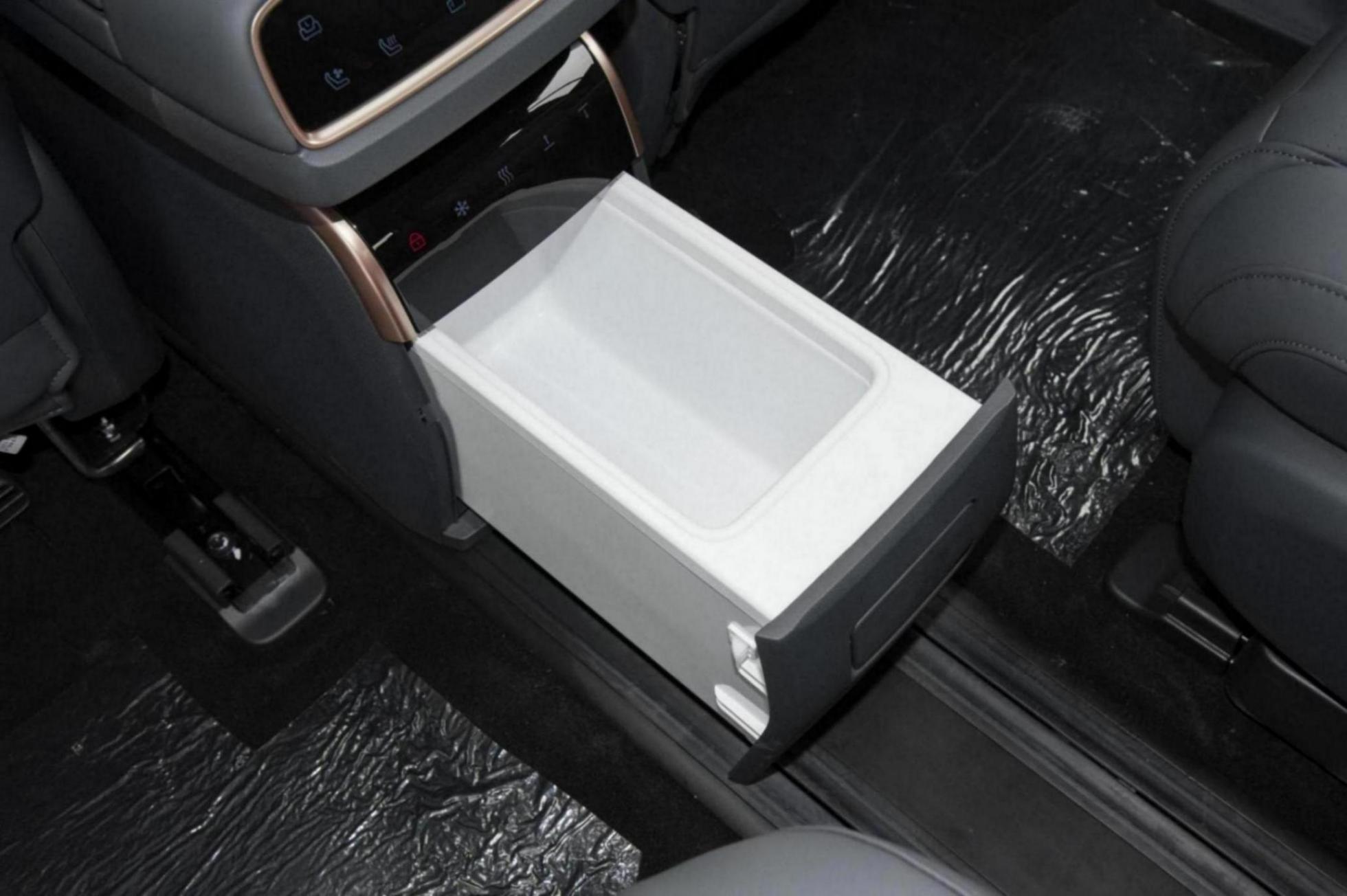 除此之外,eπ008在空間舒適性的配置也值得一提。第二排座椅底部帶有滑軌,可前后移動,隨意調整第二排乘坐空間,方便第三排進出,靈活度較高。此外,新車第二排還帶有15.6英寸的可收放大屏,娛樂性不錯,而前后可移動的冷暖兩用冰箱,則對于家有寶寶需要輔食隨時保溫的家庭比較友好,實用性挺高。