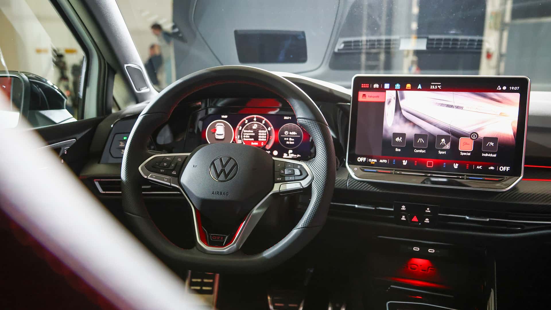 新車內(nèi)部采用與普通高爾夫相同的12.9英寸中控屏,方向盤三九點位置電容觸控按鍵回歸到傳統(tǒng)按鍵式,這是好事。
