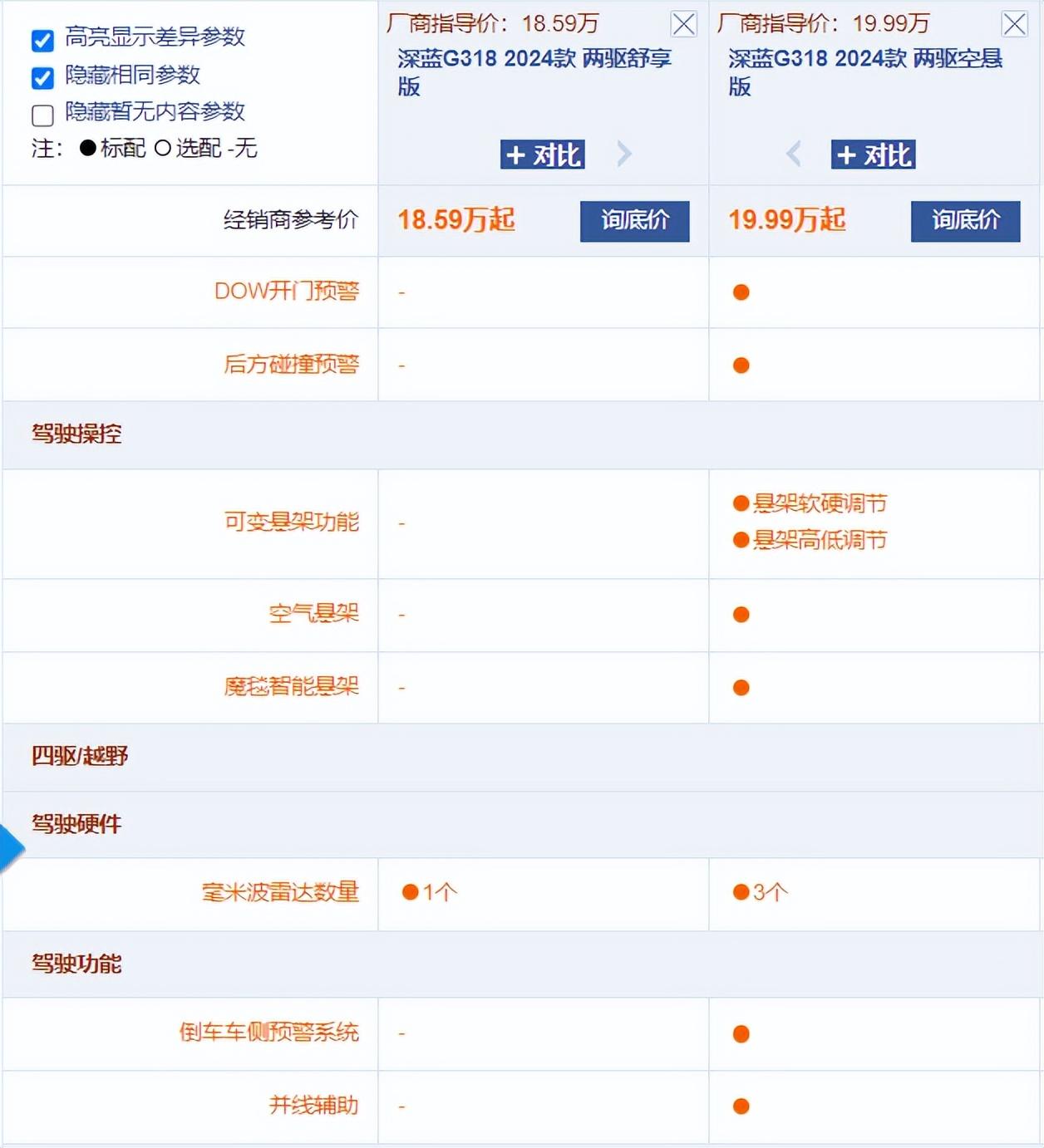 我們先來看兩驅版車型。價格上看,標準版與舒享版差價在1萬元;中配舒享版與兩驅頂配空懸版差價在1.4萬元。