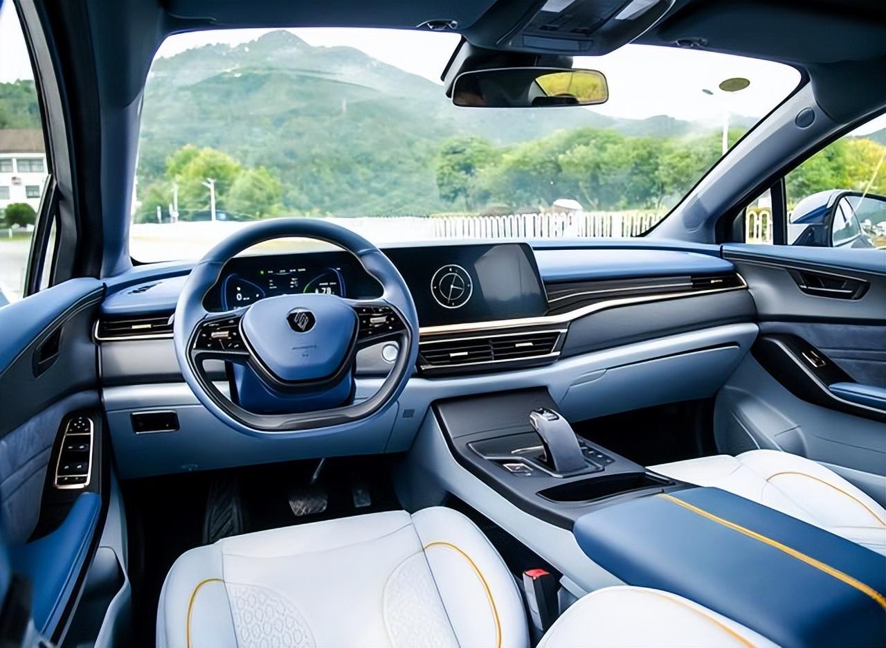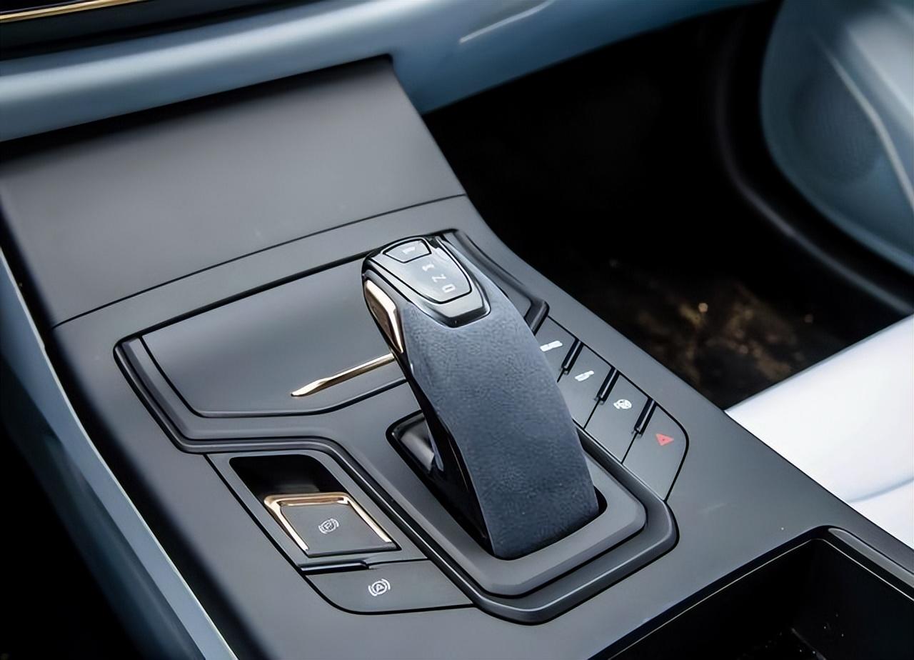 內(nèi)飾采用了淺灰色的翻毛皮、靛藍(lán)色的真皮材質(zhì),還有星星點(diǎn)點(diǎn)的銀色金屬、金色元素裝點(diǎn),這些細(xì)節(jié)的質(zhì)感非常不錯,足見廠家的用心。環(huán)抱式的中控臺布局十分簡潔凝練,平底式的雙輻式方向盤采用靛藍(lán)色真皮和金色手工縫線設(shè)計,流暢的貫穿式空調(diào)出風(fēng)口拉伸了車內(nèi)的橫向視覺效果。10.1英寸的懸浮式液晶儀表與10.25英寸的懸浮式中控彩色觸摸大屏融為一體,依舊搭載iFLYTEK娛樂生態(tài)、語音控制以及手勢控制功能(手勢控制可控制系統(tǒng)界面和音樂播放等),UI界面的設(shè)計比較簡單,雖然沒有絢麗的動畫效果和高端芯片,但是在顯示清晰度和操作流暢度上都還是不錯的。類似飛機(jī)換擋手柄也帶來了更好的操控體驗(yàn)。