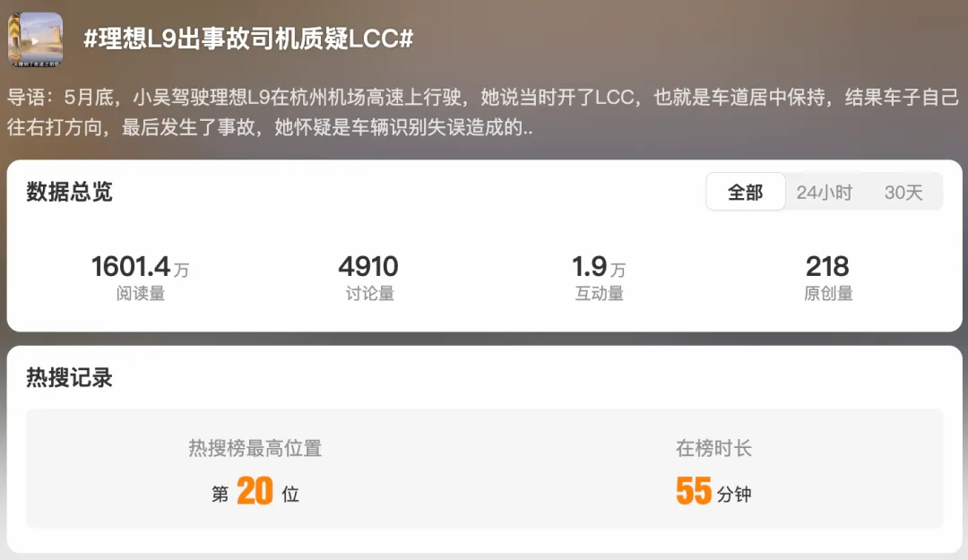 近日,一起涉及理想L9車型在杭州機場高速上發生的事故引起了廣泛關注。事故發生在5月底,當時車主開啟了LCC(車道居中輔助)功能。然而,車主表示,車輛突然自行向右打方向,導致事故發生。這起事故造成了車主大腿骨折、膝蓋骨折骨裂以及膝蓋兩側筋斷裂等嚴重傷害。